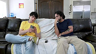 Teen hottie drills her boy while mom watches TV