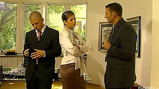 Two guys share a hot brunette's pussy in an intense threesome scene.